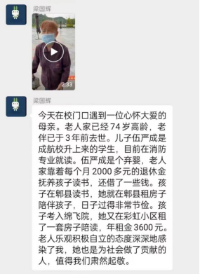 2022年,伍严成怀揣梦想,从成航校考入绵飞院消防救援技术专业。开学后不久,他的母亲到校探望,在学院校门口偶然遇到例行巡检的学院老师。经过交流得知,老人时年74岁,3年前老伴去世后,她独自抚养伍严成,母子俩的生活费、学费全靠老人每月2000多元的退休金和借款维持。